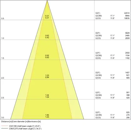 The colour code is a combination of colour rendering (CRI) and light colour (Kelvin). The first number indicates the colour rendering (1 = very poor colour rendering, 9 = maximum colour fastness). The second and third number contains the light colour. Example: the colour code 830 consists of good colour rendering (8) and warm white light (3000K). |