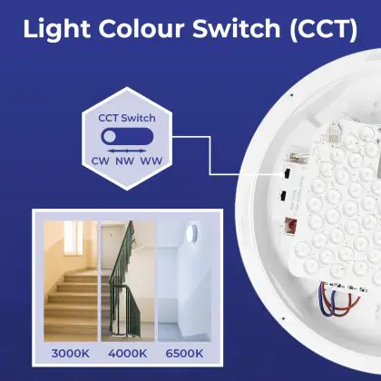 2. CCT: You choose from 2 or 3 fixed colours via a switch, such as warm white or cool white.