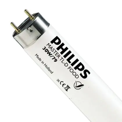 Philips TL-D Food are fluorescent tubes of 26 mm in diameter. These tubes are special because they can enhance food items, especially meat products. Philips TL-D Food 1m 36W 79 - 97cm measure 97 cm and have a G13 base type.